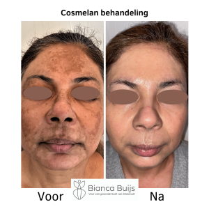 Deze voor en na foto is van een klant die de Cosmelan behandeling heeft ondergaan. Haar huid is prachtig geworden en ze lijkt meteen 10 jaar jonger.